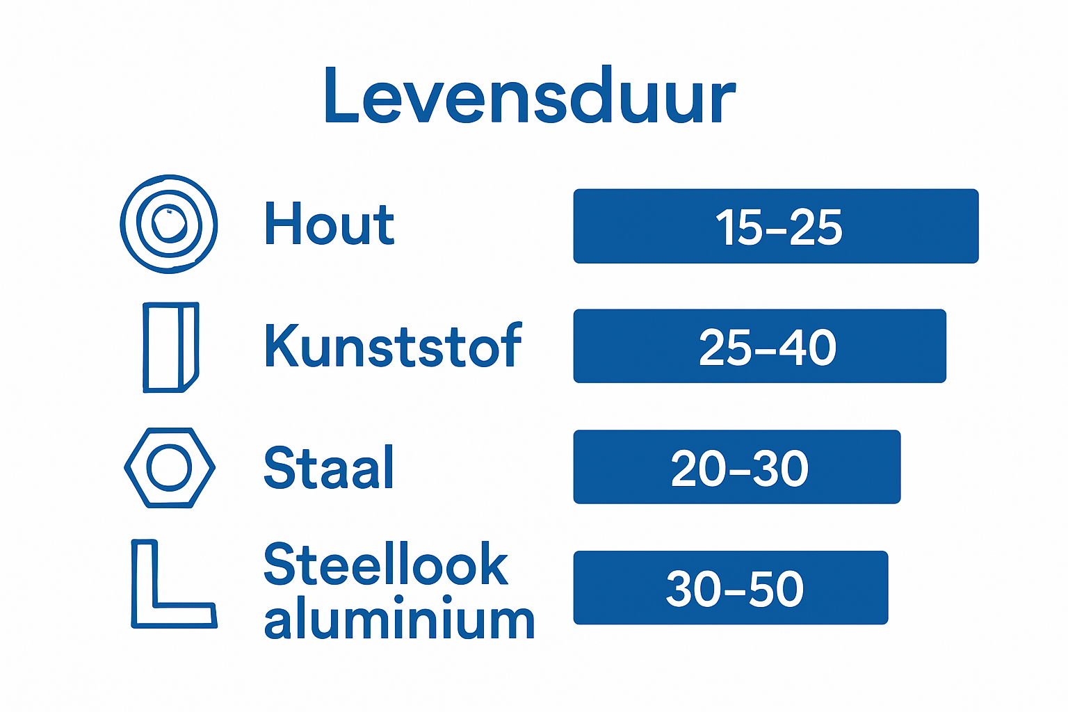 Hieronder vindt u een overzichtstabel die de gemiddelde levensduur van verschillende kozijnmaterialen vergelijkt. Deze tabel helpt u snel de relatieve duurzaamheid van elk materiaaltype te beoordelen.